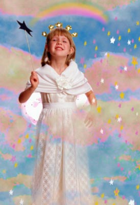 Красивое платье голубого цвета и такие же гольфы. На туфельках, волосах и поясе должны быть капроновые банты голубого оттенка. Платье нужно украсить блестками, дождиком и серпантином. Для этого костюма понадобится накрахмаленная юбка, чтобы платье казалось пышным.