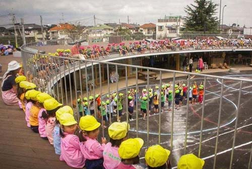 В садике нет стен, перегородок и комнат в привычном нам смысле. Здесь много свободного пространства и даже крыша садика предназначена для игр и бега по кругу. В итоге, детский сад больше похож на развлекательную площадку, чем на учебное заведение.