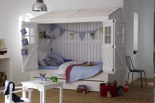 Очень интересное дизайнерское решение для следующей детской кровати. Ее можно закрыть дверками от посторонних глаз и самому скрыться, когда хочется побыть наедине с самим собой.
