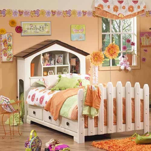 В следующей кровати изголовье сделано в виде домика, где хранятся самые нужные ребенку вещи. Смотрится очень оригинально.